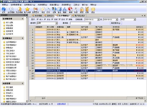 4、报表中心 包括当日明细统计,历史明细统计,账户余额统计,日汇总统计,月汇总统计,科目收支结构分析,科目收支趋势分析,科目分类统计,人员分类统计,客户收支统计,客户往来明细统计,客户收支结构分析,客户收支趋势分析,员工借款明细统计,员工借款汇总统计,转账统计,账户综合统计。