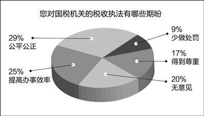 ——纳税人对公正执法的期望值较高。在回答“您对税收执法有哪些期盼”时,237份有效问卷有70份选择“公平公正”,占比29.5%。选择“少做处罚”的21份,占8.9%。在回答“您认为国税机关执法存在哪些问题”时,217份有效问卷有91份选择“人情税”、“以税谋私”、“管理不严”,合计占比41.9%。这折射出在税收执法过程中,仍存在一定程度的“人情税”、“关系税”和对不法纳税人监督不到位等问题。