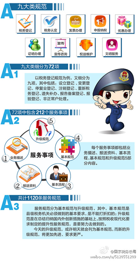 《全国县级税务机关纳税服务规范》立足办税服务厅的前台服务,对税务登记、税务认定、发票办理、申报纳税、优惠办理、证明办理、宣传咨询、权益维护和文明服务9大类72项212个服务事项1120条纳税服务规范进行了明确。