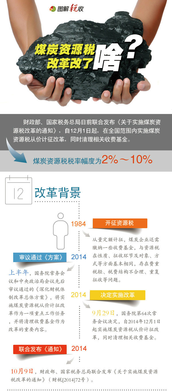 财政部、国家税务总局日前联合发布通知,明确自12月1日起,在全国范围内实施煤炭资源税从价计征改革,同时清理相关收费基金。为什么要实施煤炭资源税费改革?改革的主要内容是啥?一张图让你看懂!