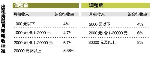 最新政策要求,月租金收入2000元以上(含2000元),30000元以下的,税收综合征收率为6%。而在过去,2000元以上、20000元以下的是6.7%,20000元以上,30000元以下的是8.38%。对比可看出,受益最大的是每月租金在20000元至30000元之间的,从8.38%降为统一6%的比率。