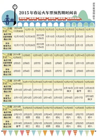 人民日报记者从中国铁路总公司获悉,从2014年12月1日起,铁路互联网售票、电话订票的预售期将由目前的20天逐步延长至60天。12月7日,提前60天开始发售2015年铁路春运第一天的火车票。