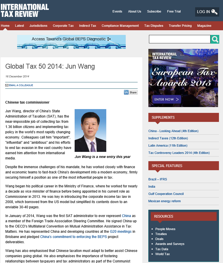 近日,《国际税收评论》(International Tax Review)杂志评出2014年度全球税收领域最具影响力的10名金牌人物和机构,中国国家税务总局局长王军当选。