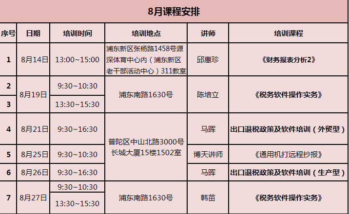 本月培训计划表安排如下,本月由于浦东小微培训基地搬迁,故培训地点转移至我司,地址为:普陀区中山北路3000号 长城大厦15楼1502室 给您带来不便 敬请谅解。如需咨询报名,请拨打53559696-1211.