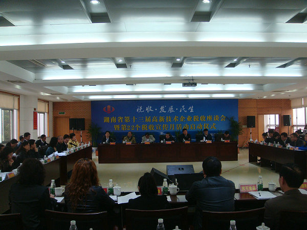 4月1日上午,我省高新技术企业税收座谈会暨第22个税收宣传月活动启动仪式在长沙举行,这也是湖南省国家税务局连续第13年举办此类税企座谈会。湖南现代威保特环保科技有限公司、株洲时代电子技术有限公司、金瑞新材料等14户高新技术企业代表和郴州市金贵银业股份有限公司等6户“惠企政策落实年”帮扶企业代表参加会议。省国税局局长丁永安,副局长皮本固、钟油子,长沙市高新区管委会主任李晓宏,管委会常务副主任邓自力,以及省经信委“推新办”和省“为民办实事”考核办有关负责人出席会议。
