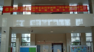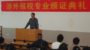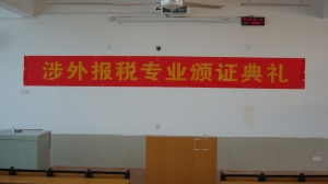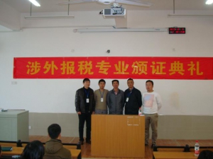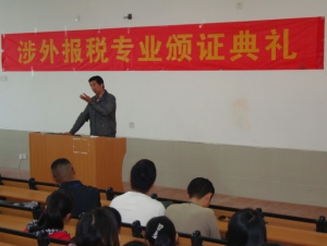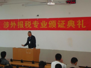 2013年12月3日,涉外报税专业湖南外贸学院第一期颁证典礼,在会计学院隆重举行,湖南外贸学院会计学院院方领导莅临出席,参加典礼的会计学院学生共计103人。合格者获得具备了相应的工作能力证书,为湖南广大财税类毕业生应聘参加工作提供了竟争实力。颁证典礼全程气氛热烈,当场咨询下次参考的学生反应积极。
