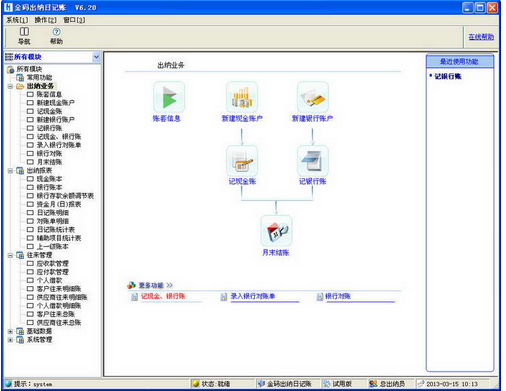 (3)、自动生成资金月报表、核算项目统计表、经手人统计表、往来单位统计表、部门统计表、对方科目统计表、银行存款余额调节表。它是国内报表最为丰富的出纳软件。